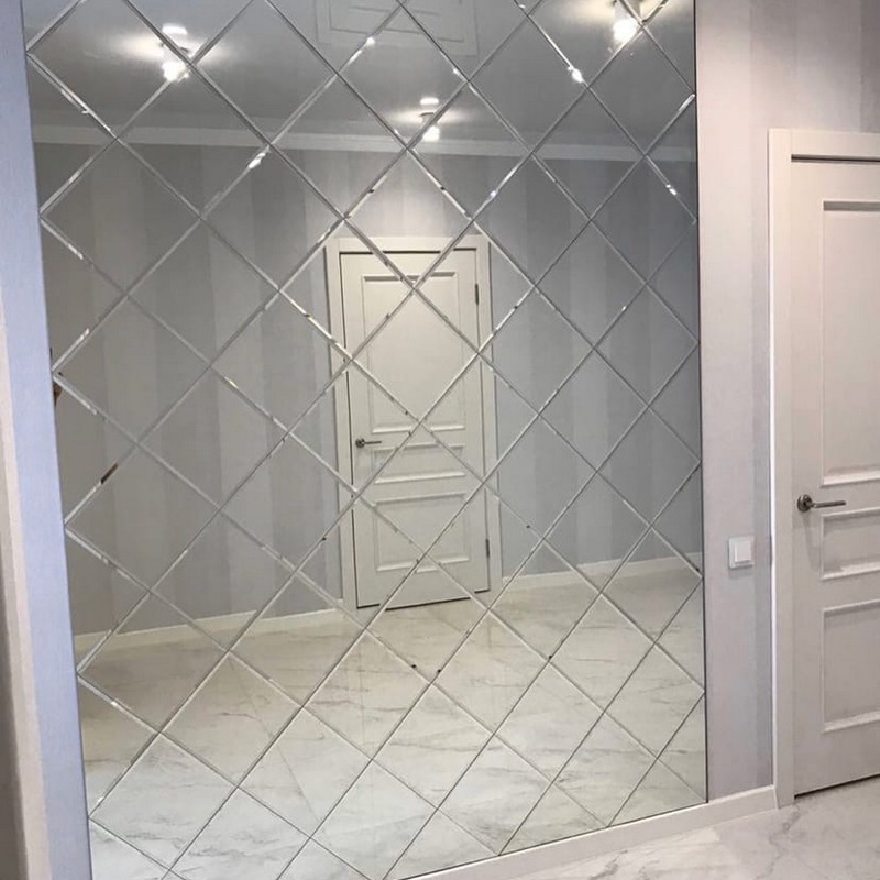 Использовалась серебристая зеркальная плитка формы "вытянутый ромб".